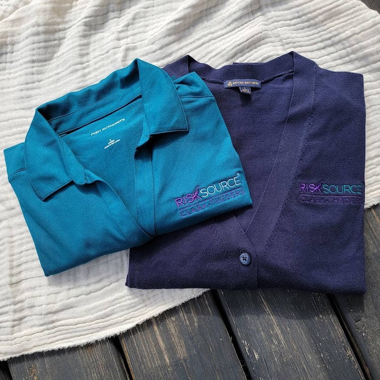 The image features two embroidered garments: a teal polo shirt and a navy cardigan, both showcasing the "RISK SOURCE" logo.