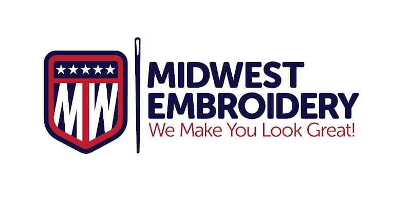 The image features the logo of Midwest Embroidery Group LLC, showcasing a bold design with red, white, and blue colors. The logo includes the text "We Make You Look Great!