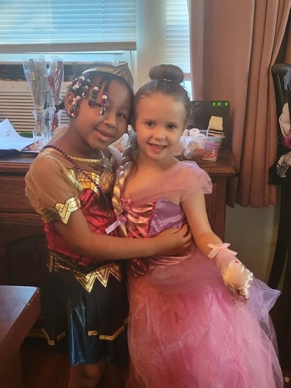 Two young girls embrace, dressed in colorful princess costumes, in a cozy indoor setting.