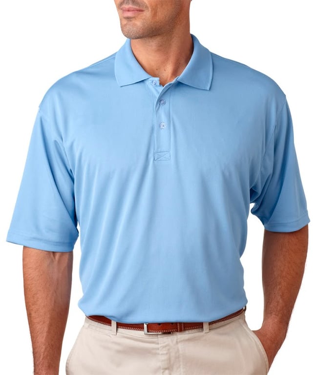 The image features a man wearing a light blue polo shirt, standing confidently with his hands on his hips. The background is neutral, emphasizing the shirt's color and style.