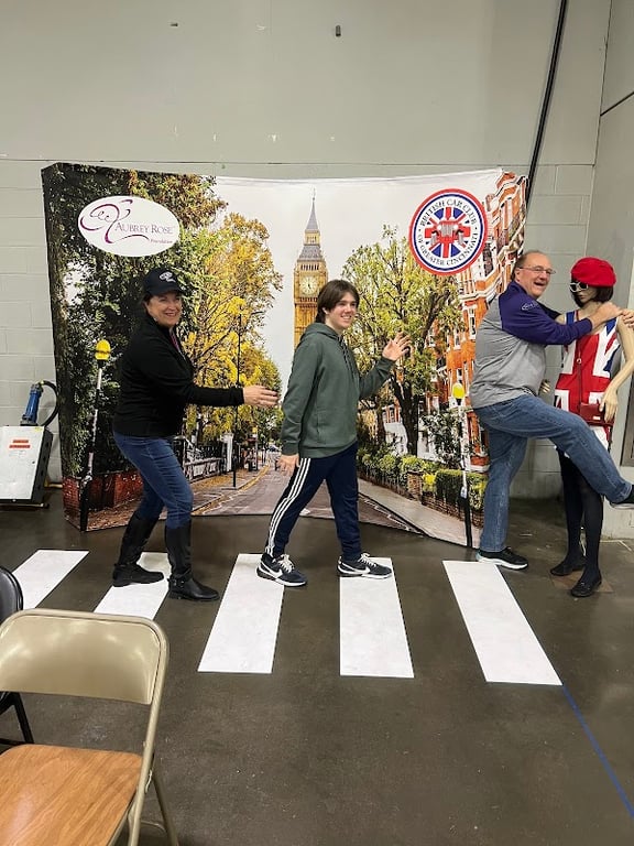A lively scene at Writely Sew LLC features three people playfully posing on a faux crosswalk in front of a backdrop depicting a London street.