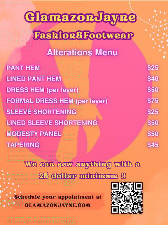 Brightly colored alterations menu for GlamazonJayne Fashion & Footwear lists various sewing services and prices, including pant hems and sleeve shortening.