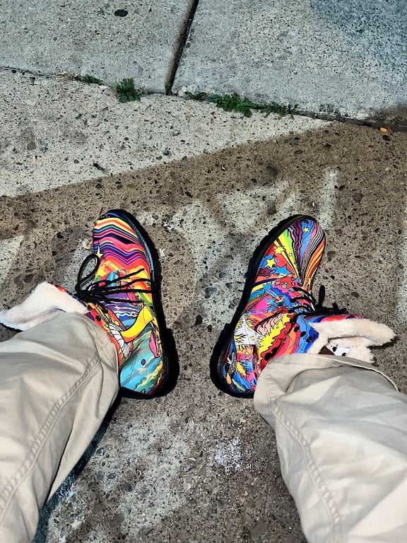 Colorful, patterned boots with vibrant swirls are prominently displayed on a sidewalk. The footwear features a cozy lining, contrasting with the urban concrete setting.