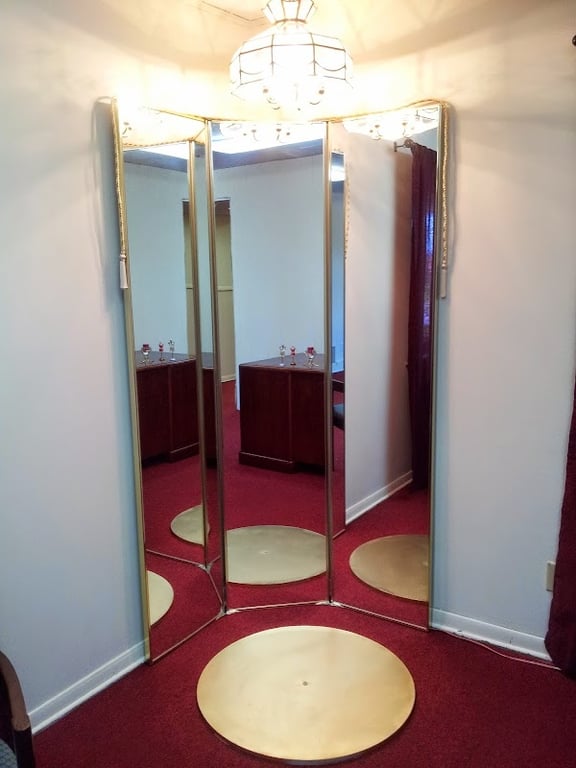 The image shows a fitting area in a sewing store, featuring a three-panel mirror and a plush red carpet.
