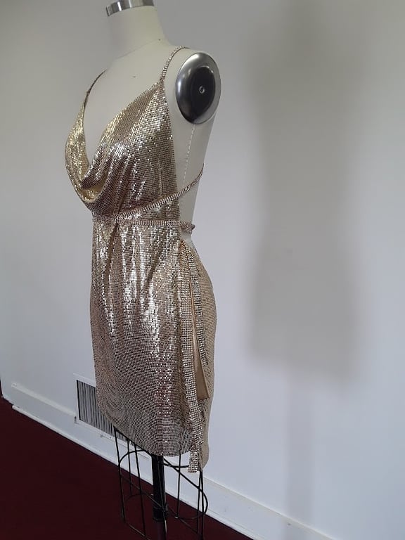 A shimmering gold dress is displayed on a dress form in a sewing store.