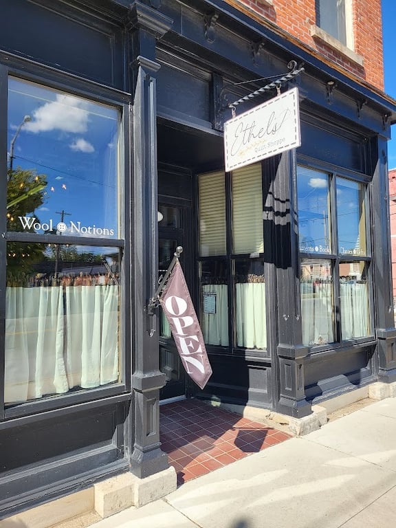 The exterior of Ethel's Quilt Shoppe features a welcoming "OPEN" sign and large windows showcasing sewing supplies.