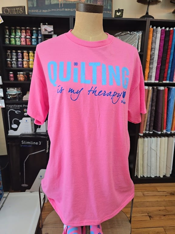 A pink t-shirt with the phrase "Quilting is my therapy" is displayed on a mannequin in Ethel's Quilt Shoppe.
