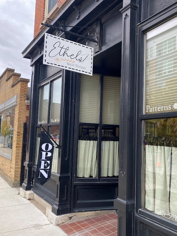 Ethel's Quilt Shoppe features a welcoming storefront with an "OPEN" sign.