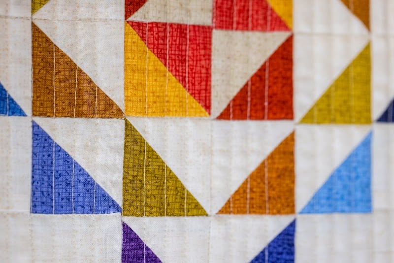 The image showcases a vibrant quilt featuring a geometric pattern of colorful triangles in shades of red, yellow, blue, and green.