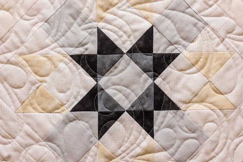 This image features a close-up of a beautifully quilted star pattern, showcasing shades of gray, black, and cream fabrics.