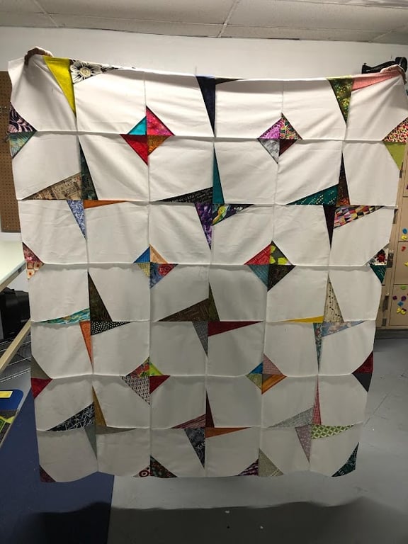 A colorful quilt top featuring various geometric patterns is displayed in a sewing store.