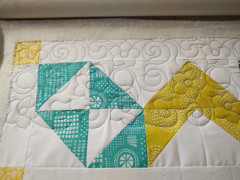 The image showcases a vibrant quilt featuring geometric patterns in teal, yellow, and white fabrics.