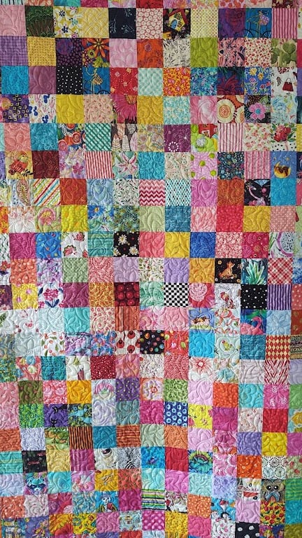 A vibrant quilt made of colorful patchwork squares showcases a variety of floral and geometric patterns.