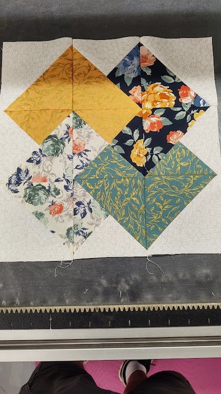 The image showcases a vibrant quilt block featuring various fabric patterns, including floral and geometric designs in yellow, blue, and green.