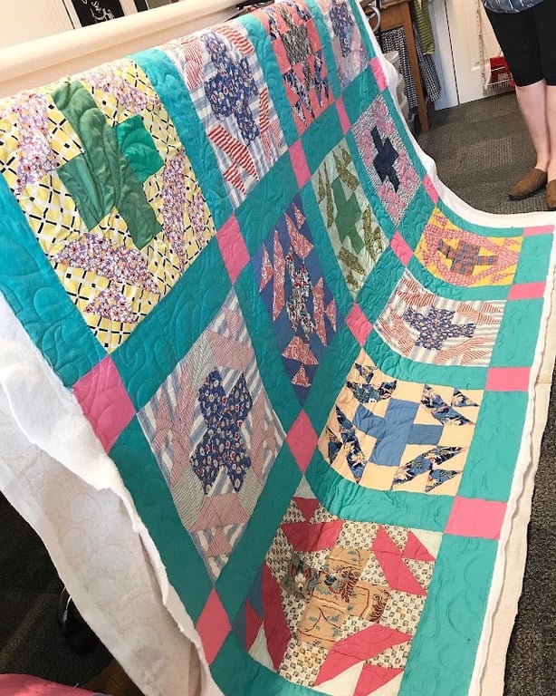 The image showcases a vibrant quilt displayed in a sewing store, featuring a variety of colorful patterns and fabrics.