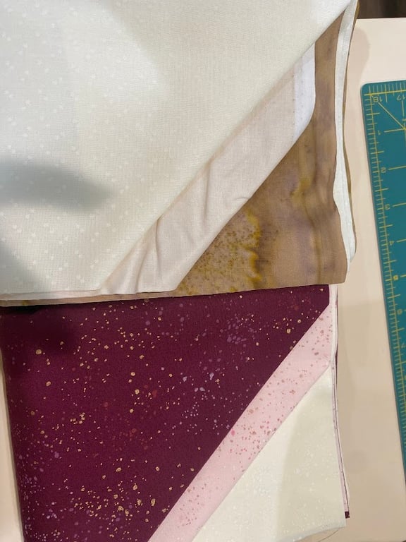 The image features a selection of colorful fabrics, including a deep burgundy with gold speckles and various lighter shades.