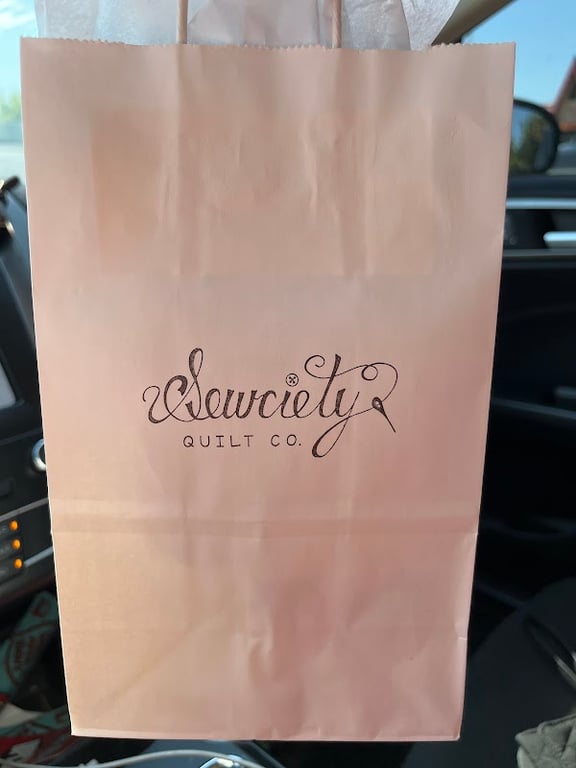 A pink shopping bag from Sewciety Quilt Co. displays the store's logo prominently. The bag is set against the interior of a car, suggesting a recent purchase of sewing supplies.