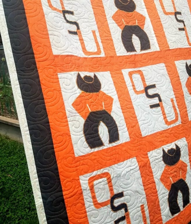 The image features a vibrant quilt showcasing a playful design with orange and black colors, depicting stylized figures and the letters "OSU.