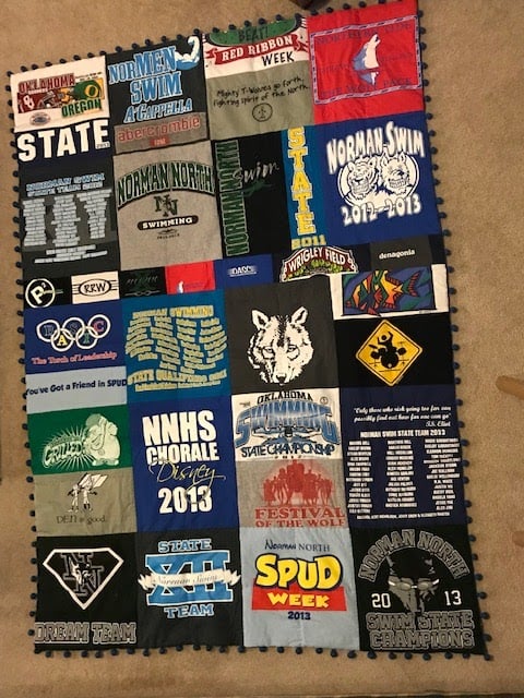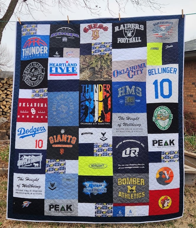 This image features a colorful quilt made from various T-shirts, showcasing logos from sports teams and local businesses.