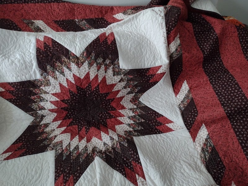 A beautifully crafted quilt featuring a star pattern in rich reds and whites is displayed prominently.