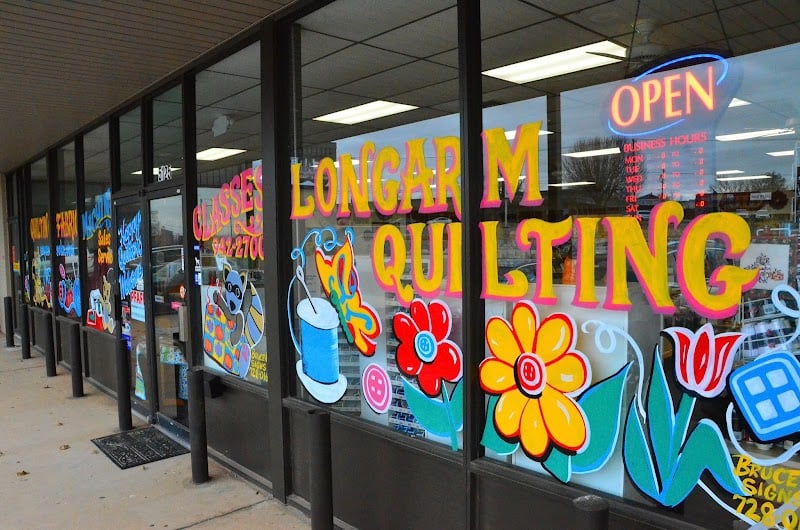 The image shows the vibrant storefront of Sew & Sews, Inc., featuring colorful window art promoting longarm quilting and sewing classes.