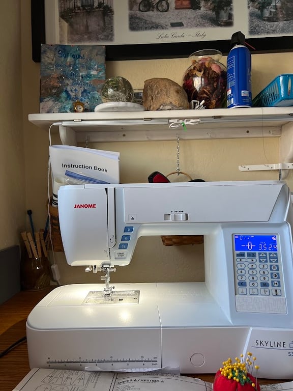 The image features a Janome Skyline sewing machine on a wooden table, surrounded by sewing supplies.