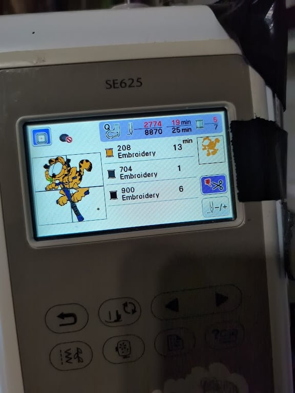 The image shows a close-up of a sewing machine's display screen, featuring an embroidery design of a cartoon character.