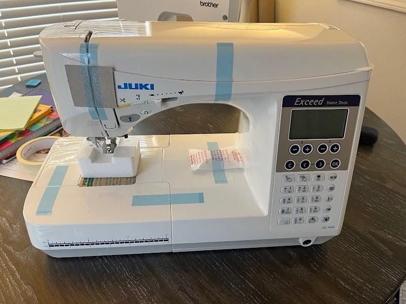 A Juki Exceed sewing machine is prominently displayed on a wooden table, featuring blue tape for protection.