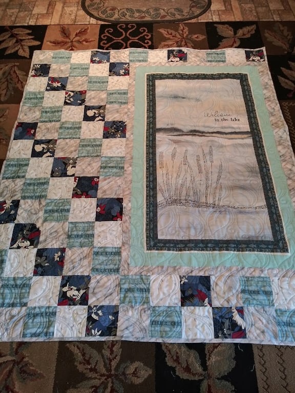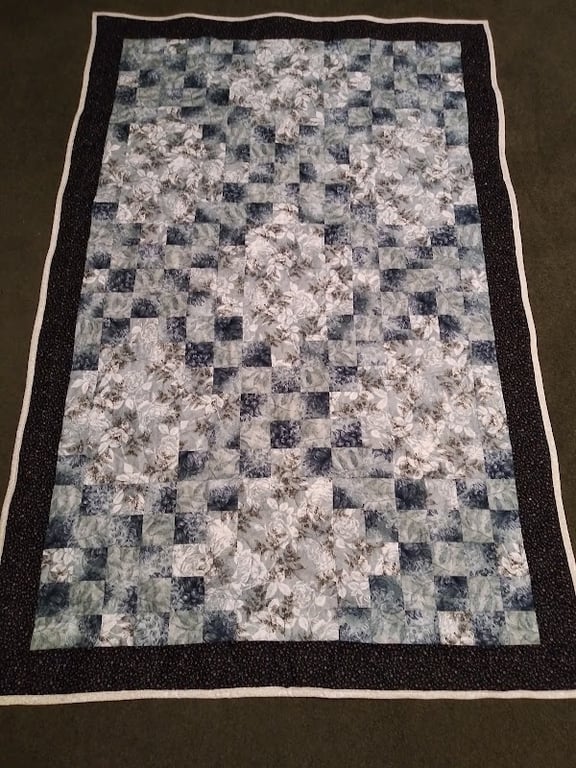 A beautifully crafted quilt features a patchwork design in shades of blue and white, bordered by a black fabric.