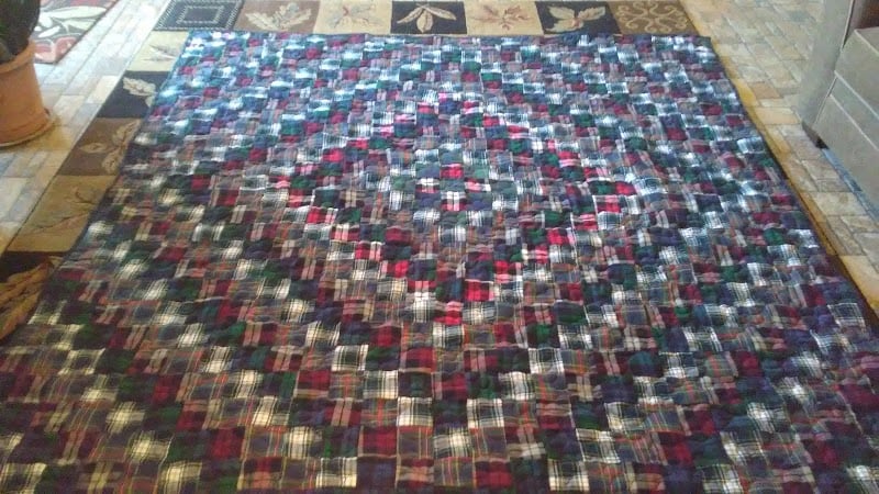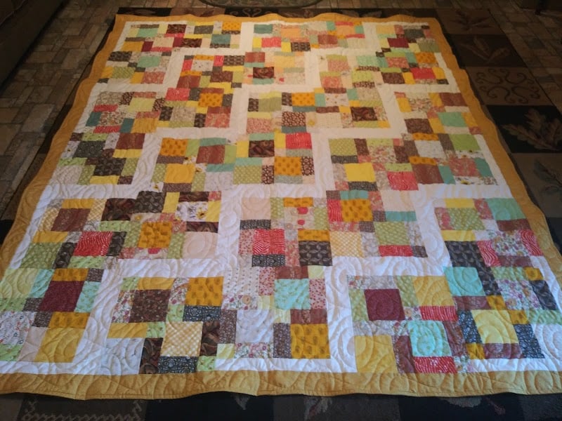 A colorful quilt featuring a patchwork design of squares in various fabrics, including yellows, greens, and browns, is displayed on a textured floor.