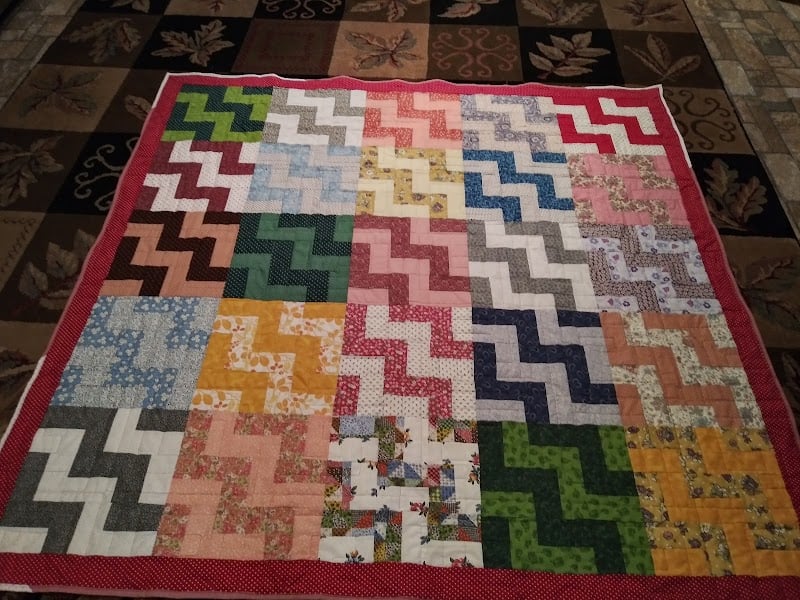 A colorful quilt featuring a zigzag pattern made from various fabrics in shades of pink, blue, green, and yellow is displayed on a patterned floor.