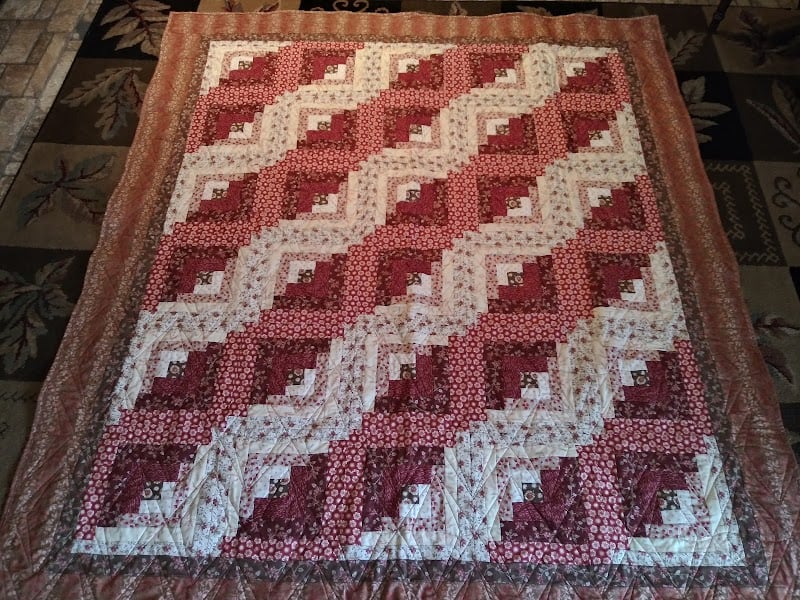 A beautifully crafted quilt features a striking log cabin pattern in shades of red and cream, displayed on a textured surface.