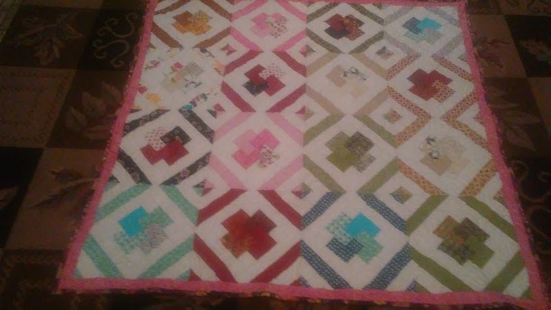 A colorful quilt features a geometric pattern with various fabrics in shades of pink, green, red, and blue, bordered by a pink trim.