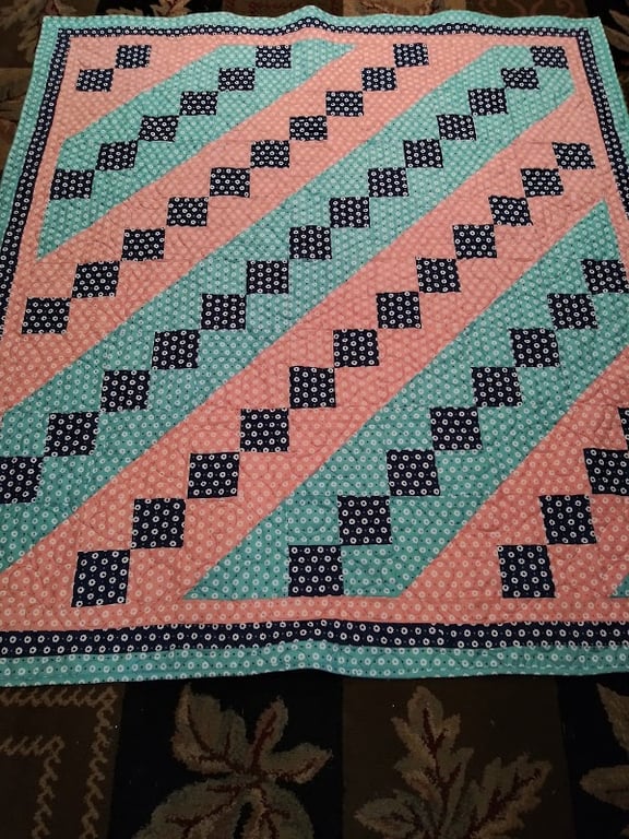 A colorful quilt features a diagonal pattern of pink, teal, and navy blue fabrics with polka dots and squares.