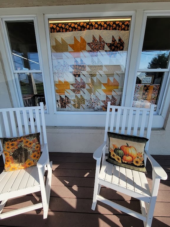 The image shows a cozy sewing store exterior with a colorful quilt display featuring autumn leaves in the window.