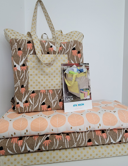 The image showcases a colorful fabric tote bag with floral and polka dot patterns, accompanied by two rolls of fabric featuring leaf designs.