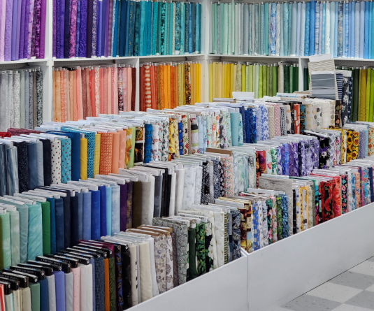 The image showcases a vibrant array of fabric bolts neatly arranged on white shelving in a sewing store.