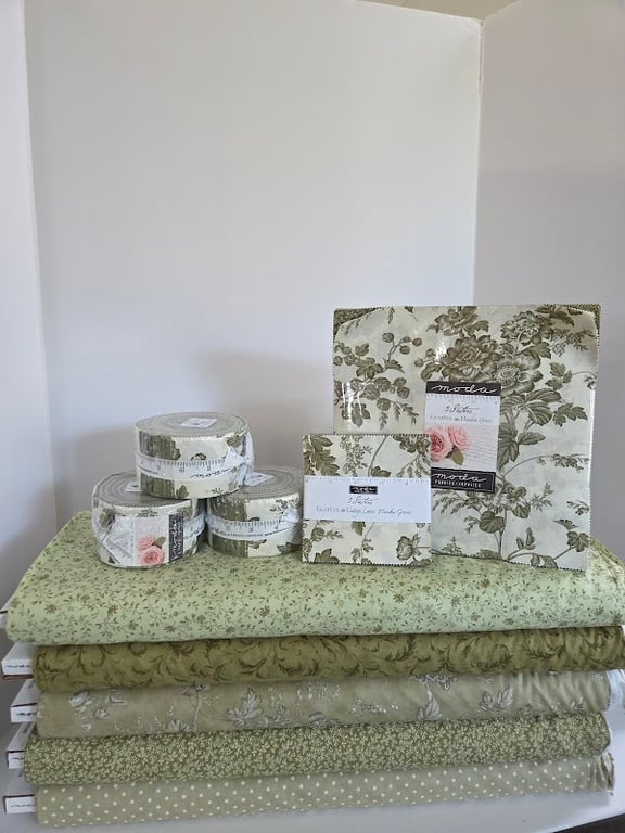 The image showcases a display of various green fabrics and sewing supplies at Bird-in-Hand Fabric.