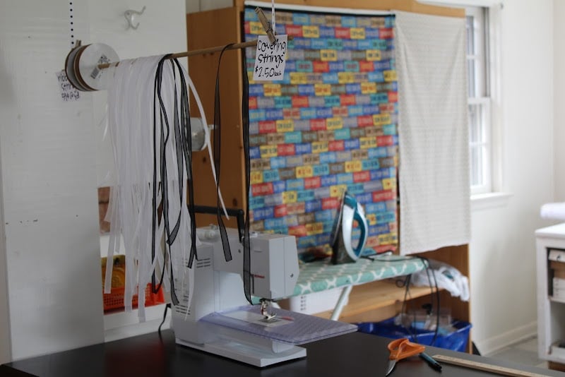 The image shows a sewing machine prominently displayed in a bright, organized fabric store.