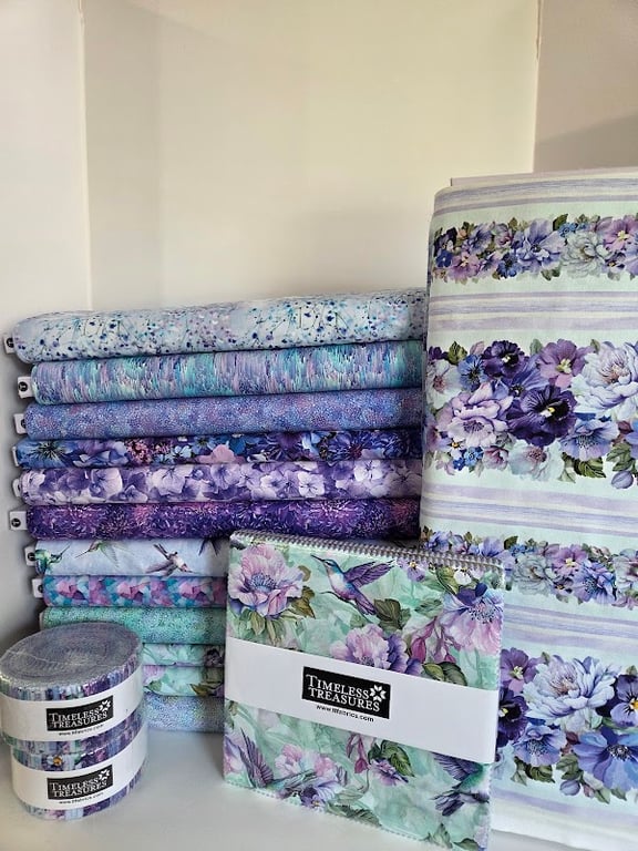 The image showcases a vibrant display of various fabrics in shades of purple and blue, neatly stacked on shelves.
