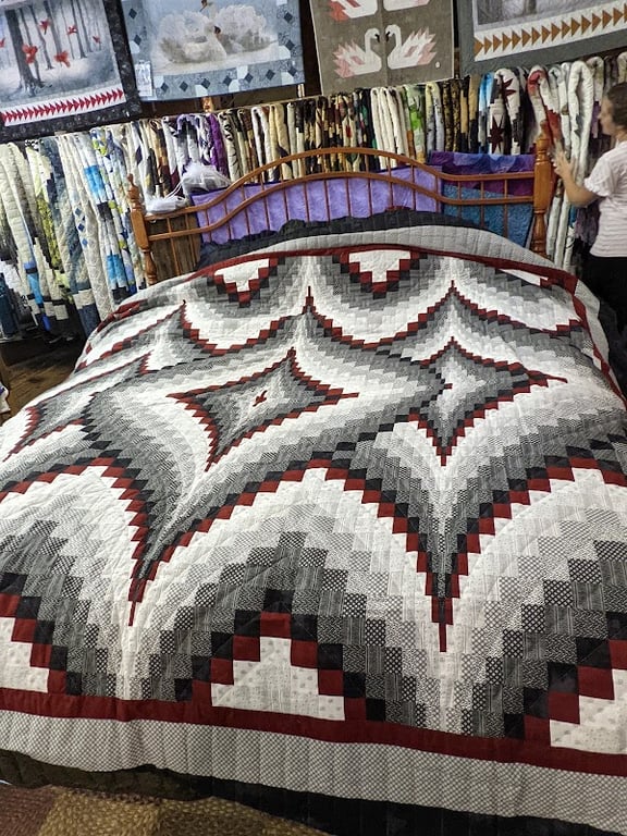 Stopped here on my way home, passed many times before. This place is huge! Lots of kits, notions, fabrics and of course, beautiful hand made quilts. Will definitely be stopping here again.