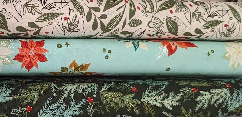 The image showcases three rolls of festive fabric featuring holiday-themed patterns, including poinsettias and evergreen foliage.