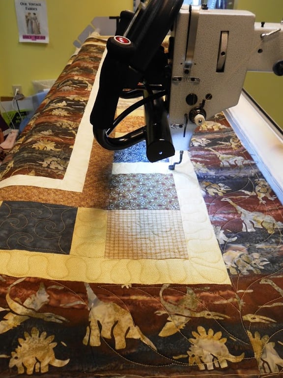 A quilting machine is positioned over a colorful quilt featuring dinosaur patterns and various fabric textures.