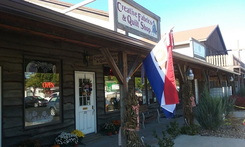 The image shows the exterior of Creative Fabrics & Quilt Shop, featuring a welcoming entrance with an "Open" sign.