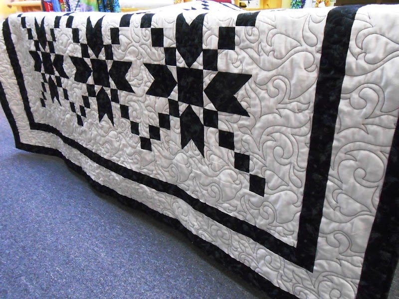 A beautifully crafted black and white quilt featuring star patterns is displayed prominently in the sewing store.
