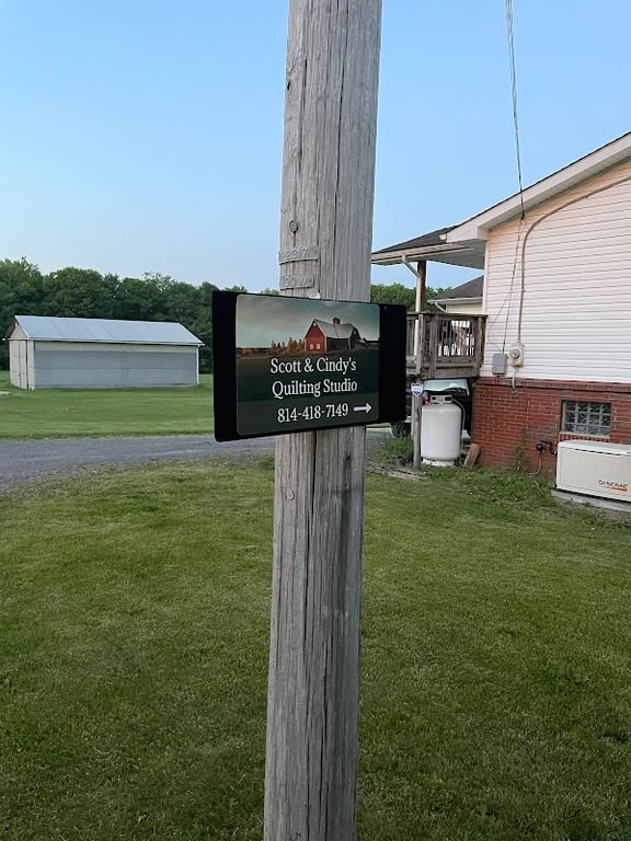 A sign for Scott & Cindy's Quilting Studio is mounted on a wooden post, directing visitors to the studio.