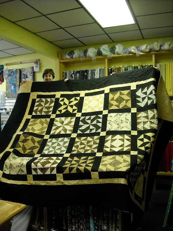 A woman holds up a large, intricately designed quilt featuring black and gold patterns in a cozy sewing shop.