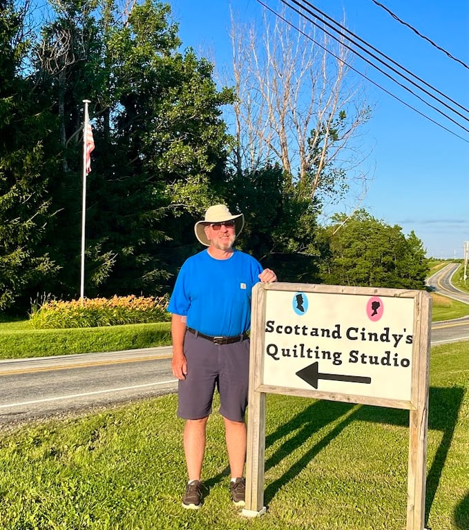 A man stands beside a sign for Scott and Cindy's Quilting Studio, indicating the direction to the studio.