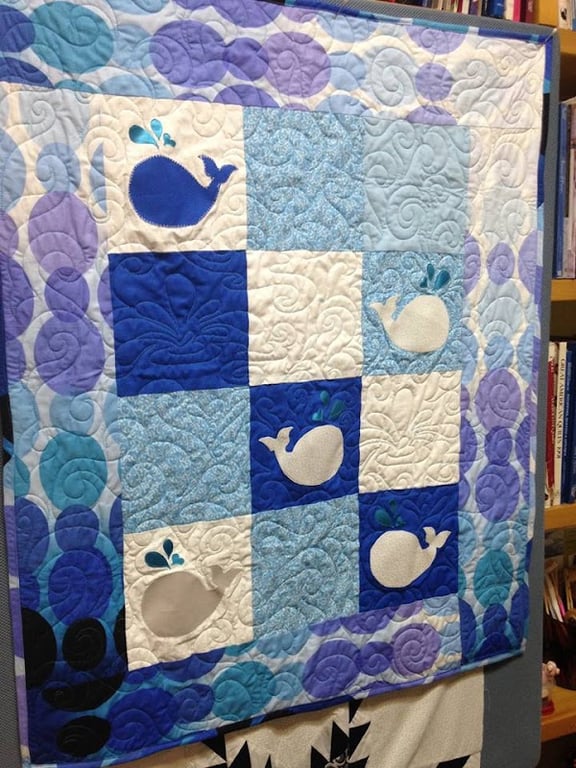 A colorful quilt featuring whale designs in shades of blue and white hangs on a display in a sewing shop.