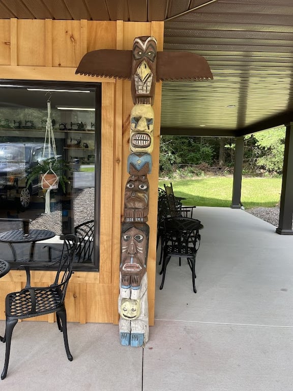 The image shows the exterior of The Sew'n Place, featuring a wooden totem pole with colorful carvings.